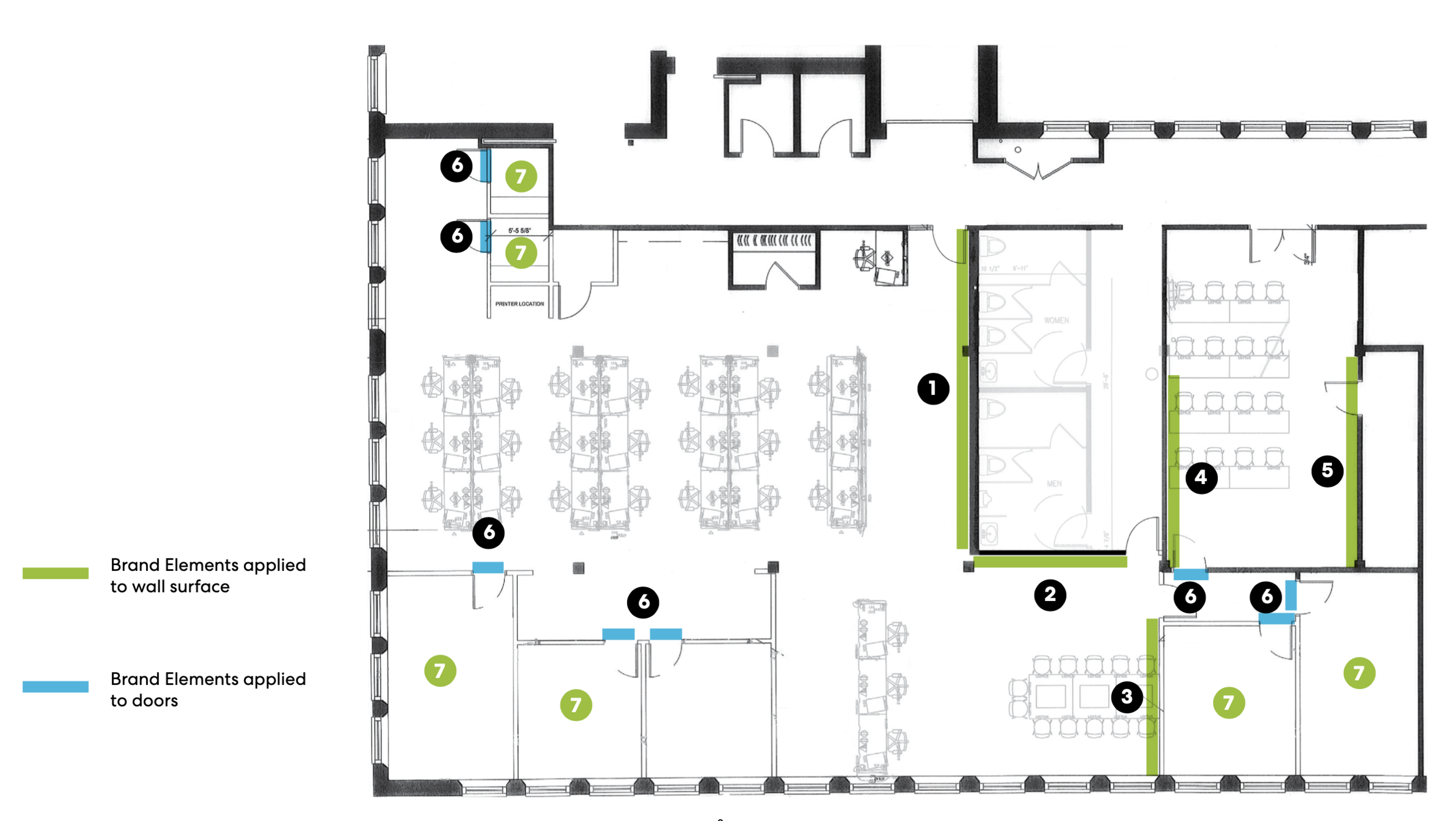 We met and walked the office to understand the main routes different groups would take to better see which areas we could design with the most impact. From it we distinguished these areas as key impact areas for design.